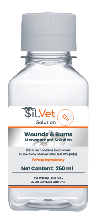 Sil.Vet Solution is intended for use in animals and pets, by or under the supervision of a veterinarian for disinfection, management, moisturizing and healing acceleration of wounds, different types of ulcers, post-surgical wounds, first and second-degree burns, cuts abrasions, and minor skin irritations.