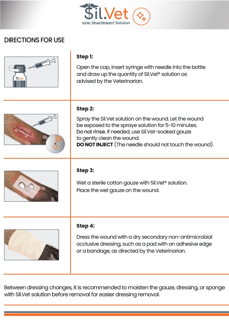 SilVet® Solution can be applied on the wound via a syringe, a spray bottle, irrigation, lavage system or pouring onto a gauze/dressing or sponge.